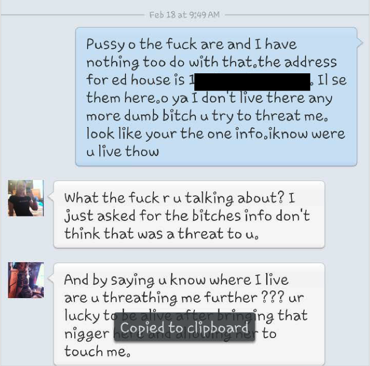 Messages containing racist language toward another woman she was trying to get information about. The conversation also references a man David was sexually involved with in a private bisexual relationship while also dating women, as well as discussion of past addresses that David states he no longer lives at.